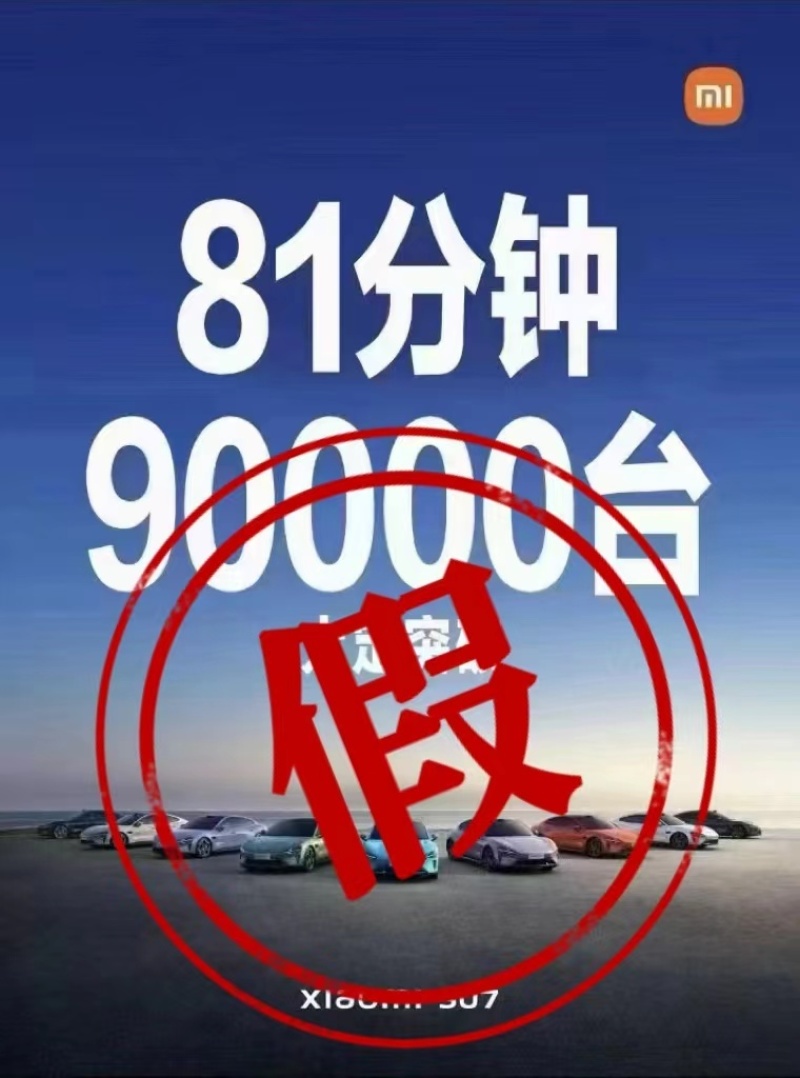 The first model of Xiaomi, SU7, was officially launched last night. According to official data, the car broke through 10,000 in 4 minutes, 20,000 in 7 minutes and 50,000 in 27 minutes, and the data has not been updated yet. In addition, last night, a poster of "SU7 broke through 90,000 sets in 81 minutes" was circulated on the Internet, and Wang Hua, general manager of Xiaomi’s public relations department, made a fake.