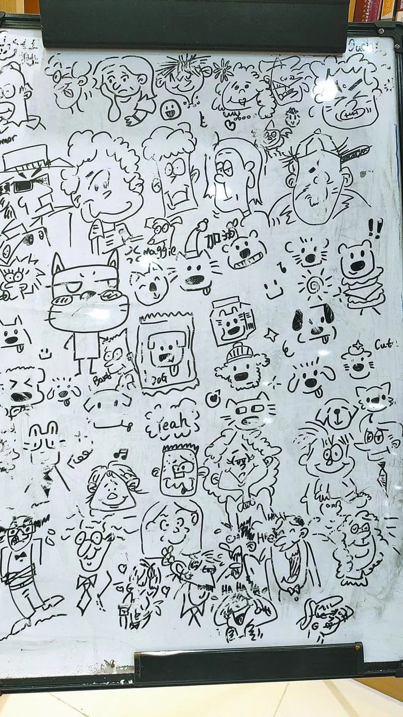 Pengpeng is thin and thin, but writing on the handwriting board is a breeze. He listed his four hobbies to me: watching cartoons, studying fruit juice, watching movies and traveling. His major is graphic design and he dreams of becoming a cartoonist. "Those are all painted by my colleagues. They are really great." Pengpeng pointed to a whiteboard near the wall, on which are portraits quietly drawn by silent baristas for customers, which are lovely and vivid. This is their little fun after work.